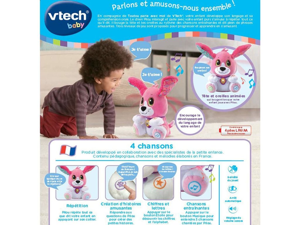 Pro naše děti chceme jen to nejlepší, a proto bychom Vám chtěli představit Plyšová hračka se zvukem Vtech Baby Doggie Talk to me (FR) pes , perfektní pro všechny, kteří hledají kvalitativně vysoce hodnotný produkt pro nejmenší. Nakupte Vtech Baby za ty nejlepší ceny!- Barva: Růžová