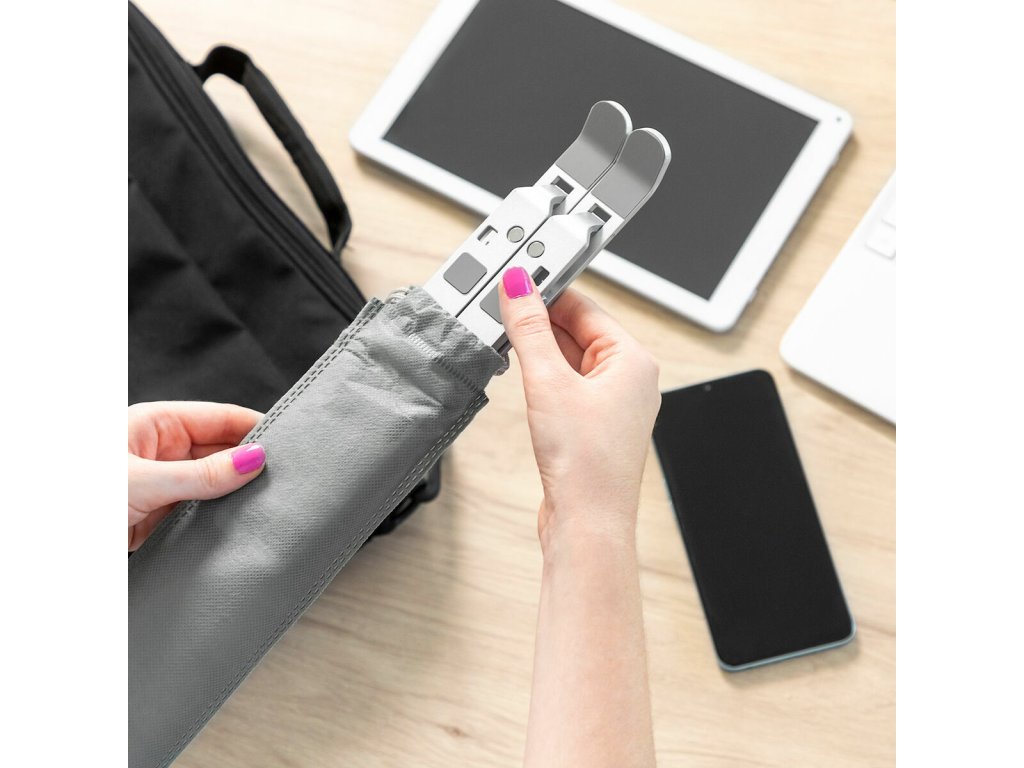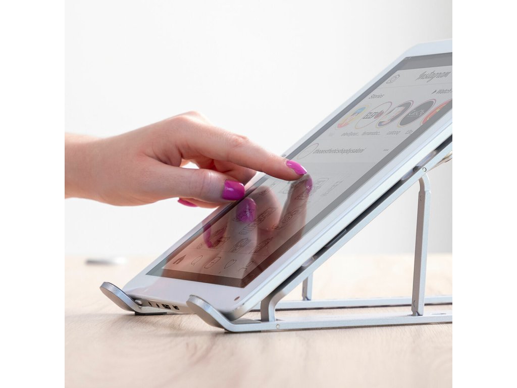 Skládací hliníkový stojan na notebook Flastan InnovaGoods je lehký, snadno přenosný a má až 7 úrovní sklonu. Má protiskluzové silikonové body a je roztažitelný do šířky, takže je možné jej použít i na jiná zařízení, jako jsou tablety, mobily, čtečky elektronických knih atp.Tento stojan na notebook podporuje správné držení těla. Jeho otevřená struktura usnadňuje větrání zařízení. Je ideální pro práci na dálku a do kanceláře. Obsahuje přepravní tašku.